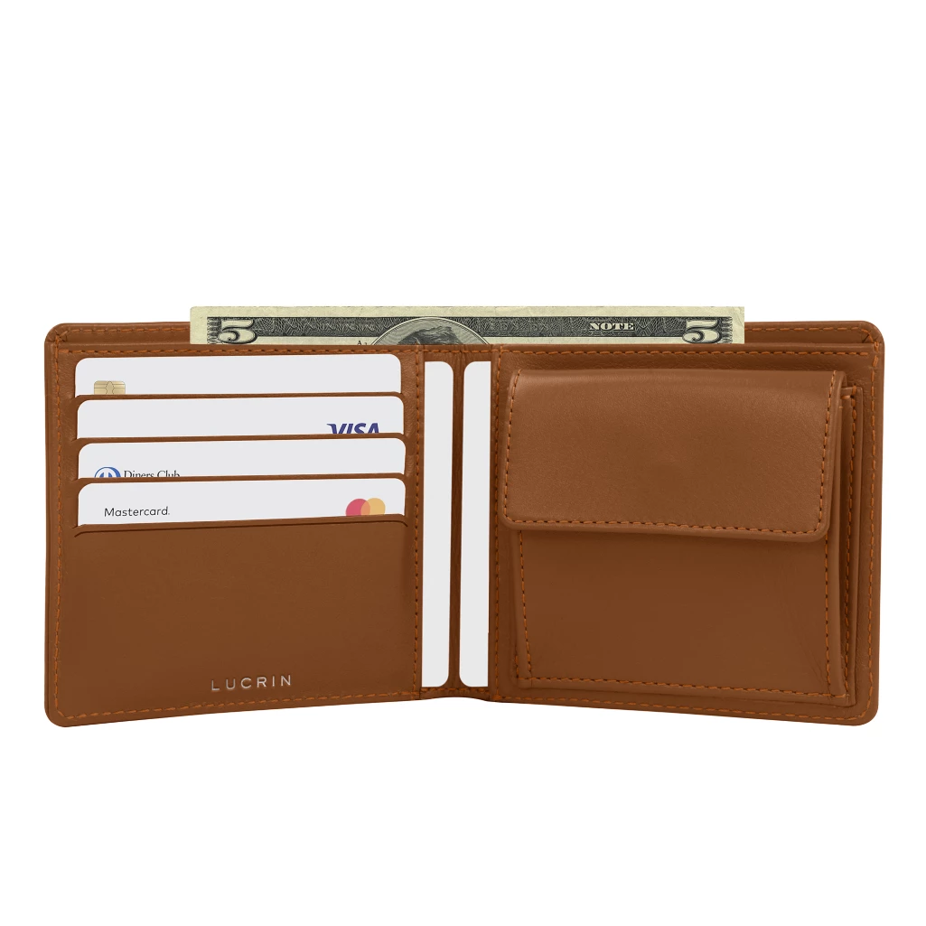 Se desiderate portare tutto con voi, scegliete questo portamonete standard in cuoio di lusso concepito dai migliori artigiani pellettieri di LUCRIN. A sinistra ci sono 4 fessure per le carte di credito e sotto una tasca piatta supplementare, dove potete inserire, per esempio, le ricevute. Lo stesso vale alla destra di questo portamonete: troverete la stessa tasca piatta, ma al di sopra un'altra con un bottone automatico, ideale per riporre le monete. Questo portafoglio in cuoio presenta anche una tasca grande per le banconote e le piccole carte .