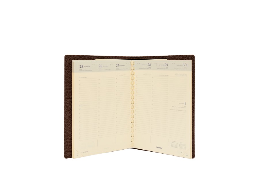 Agenda Tascabile Settimanale rimovibile in pelle. Venduta con agenda divisa secondo i giorni della settimana – una settimana su due pagine – con spirale di marca Brepols Timing.
