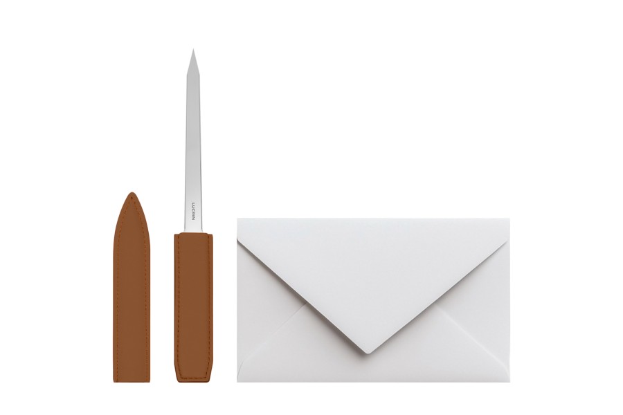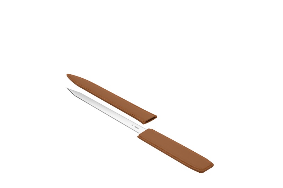 Un vezzo irrinunciabile per gli amanti del bello anche negli oggetti e negli accessori: questo tagliacarte, che coniuga a perfezione l'eleganza con la praticità, è dotato di una lama in ottone di 13.6 cm rivestita d'argento in grado di aprire buste postali con estrema facilità e accuratezza. Una volta utilizzato, esso potrà essere riposto nella sua custodia in pelle, proprio come una spada! La sua impugnatura realizzata in pelle consente una facile presa durante l'utilizzo.
